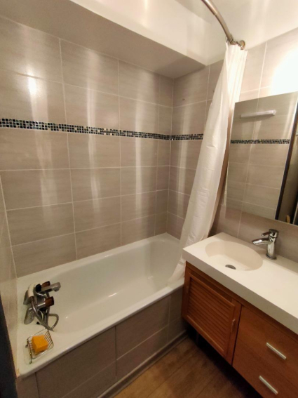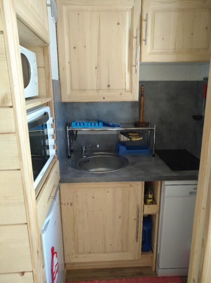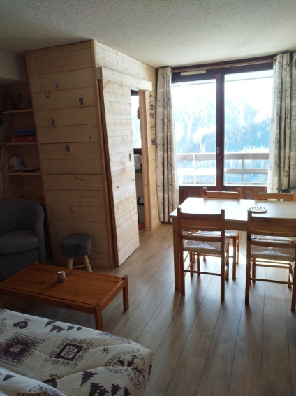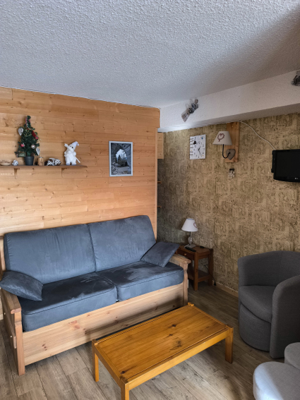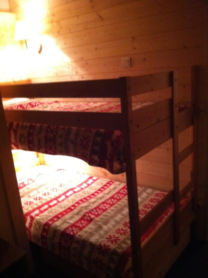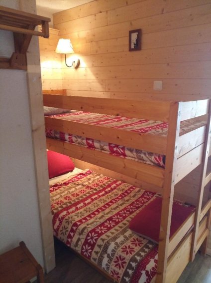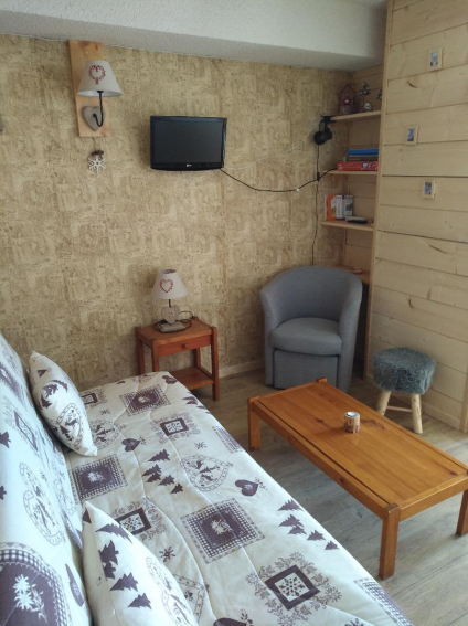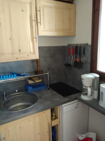 Appartement comprenant entrée avec coin montagne (lits superposés) , séjour avec banquette clic-clac, et kitchenette fermée.