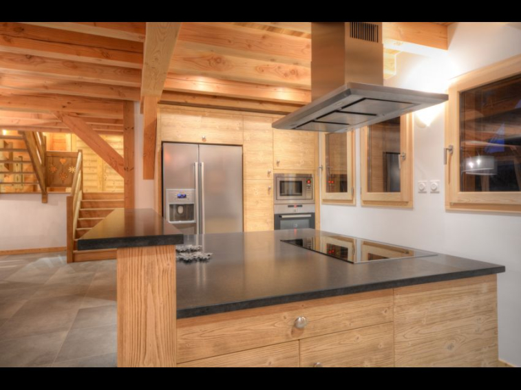 - une cuisine ouverte sur la salle à manger avec bar, plan de travail en granit, 2 lave-vaisselle, 2 fours à chaleur tournante, 2 micro-ondes, une plaque induction de grande largeur, un réfrigérateur américain avec fabrique automatique de glaçons, un évier avec égouttoir taillé dans la masse du plan de travail granit et robinet professionnel. Tout le nécessaire de cuisine pour 20 personnes est fourni, avec casseroles, cocotte-minute, robot mixer, grille-pain, cafetière Nespresso (capsules classiques), cafetière traditionnelle à filtre papier, appareils à fondue, appareils à raclette, assiettes, couverts et verres en grandes quantités, etc …