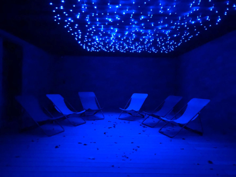 - Une grande terrasse de 100 m2 en bois composite avec transats et espace de détente avec éclairage en fibre optique colorée dans l'esprit chromothérapie.