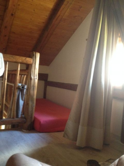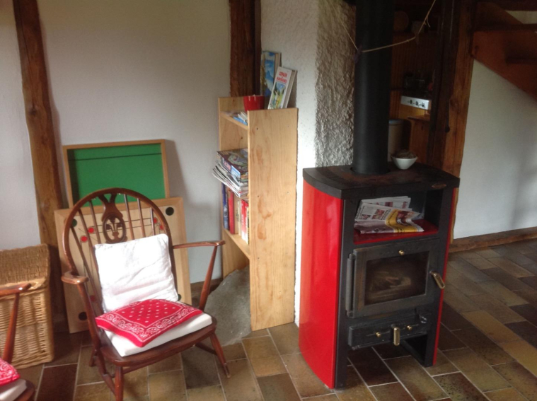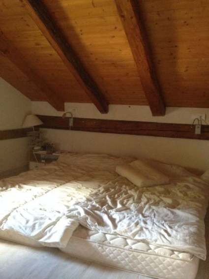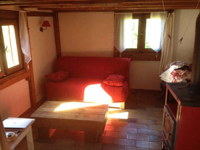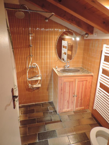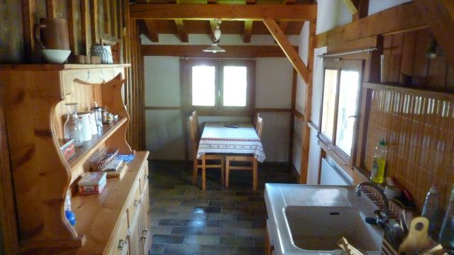 Une remise de 45 m² au sol avec séjour, cuisine (plaques, four, lave-vaisselle), convertible de 160 x 200. A l'étage, en mezzanine, lits jumeaux 2 x 90 x 200 + lit de 90 x 180 séparé par un rideau. Chauffage par poêle à bois + radiateur électrique. Salle de bains avec douche. 1 wc. Vous disposez d'une grande terrasse de 30 m² avec vue exceptionnelle sur les montagnes. Buanderie commune avec lave-linge et sèche-linge.