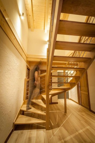 L’espace principal de vie se situe au premier étage, il est d’une surface d’environ 75 m². Vous pouvez y accéder par un escalier ou par l’ascenseur. Grace à son volume le chalet offre une ambiance chaleureuse et conviviale, vous pourrez tous vous réunir dans le salon ou la salle à manger.