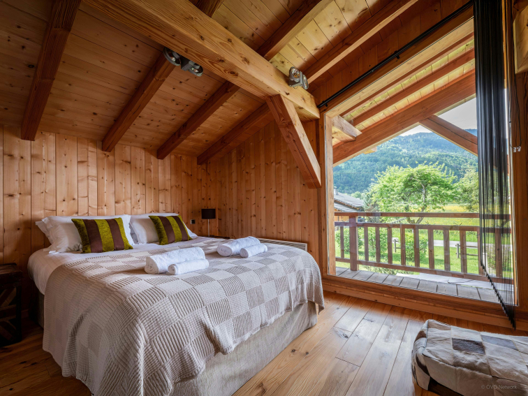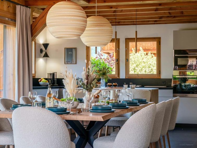 Jusqu’à 12 vacanciers (dont 10 adultes) peuvent séjourner au Chalet OCimes, qui compte cinq chambres et six salles de bains aménagées sur deux étages.