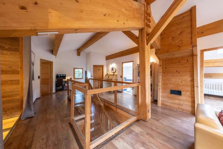 Un escalier en bois qui vous mène à l’étage, où vous trouverez un petit espace bureau avec imprimante ainsi qu'un coin détente avec sol vitré