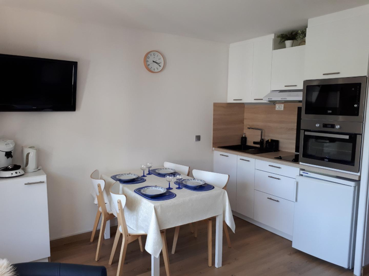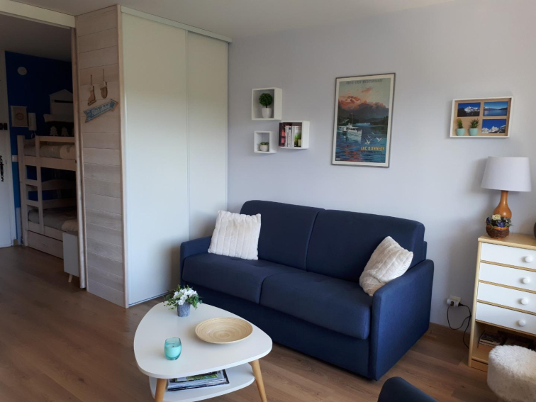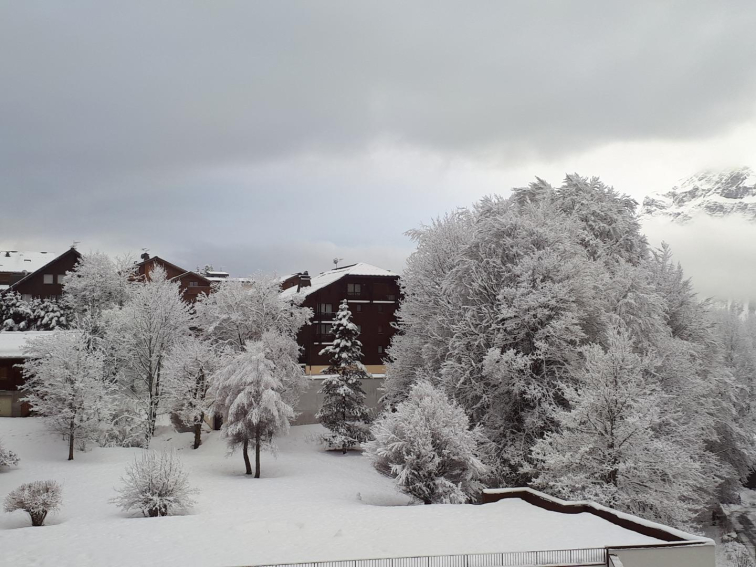 Grand studio lumineux, dans résidence calme, à 200 m du centre par chemin piétonnier, proche commerces, cinéma et patinoire, exposé Sud, grand balcon avec vue montagne, garage fermé, casier à skis,