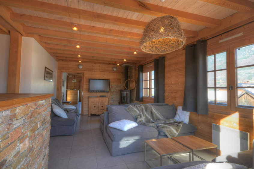 Décoration très soignée (pierres, murs en bois chauffé brossé, poêle/cheminée, mobilier et literie neufs, de qualité et coordonnés, rideaux coordonnés, éclairages travaillés, etc ...)